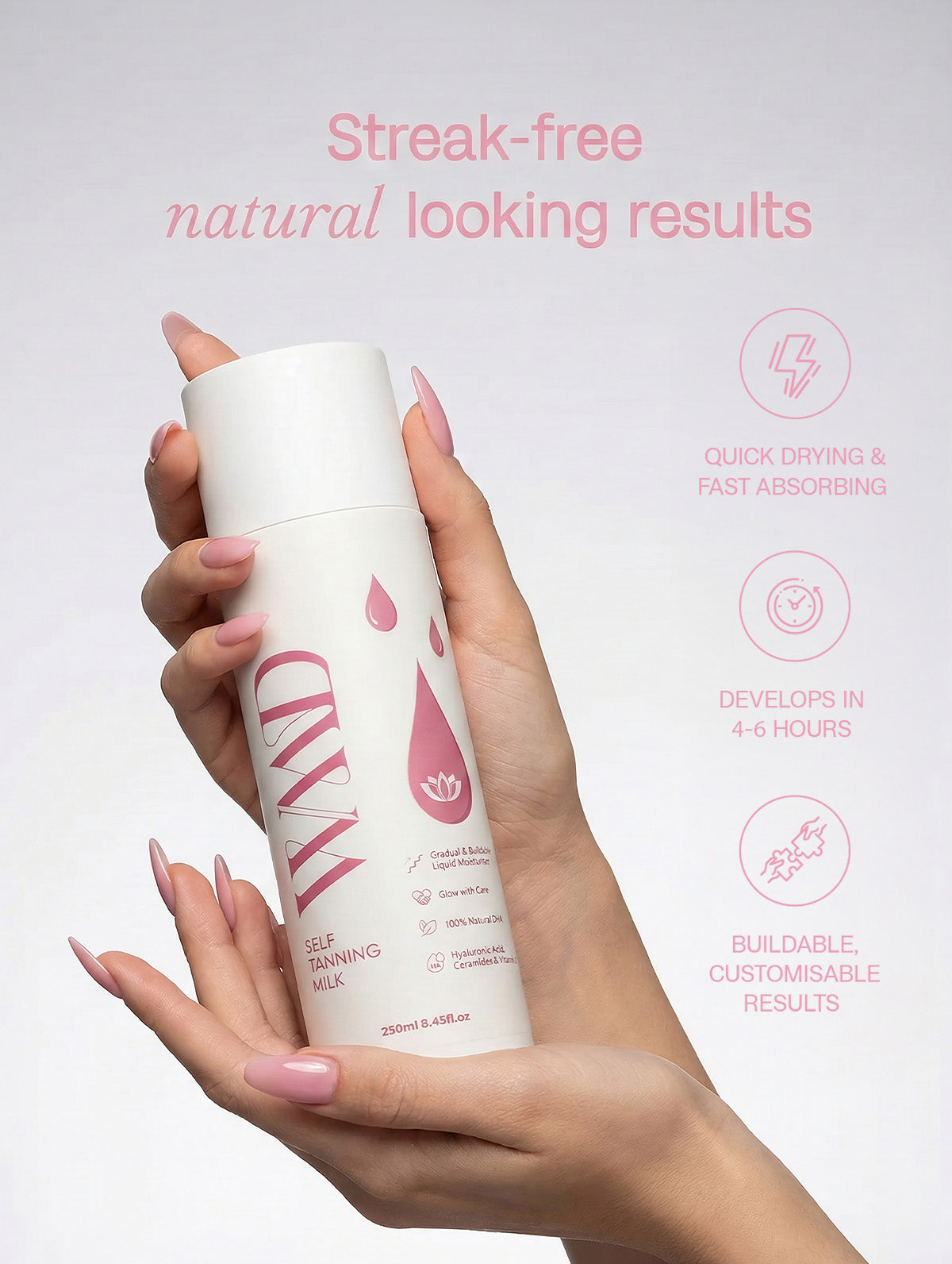 The lightweight milk absorbs almost instantly, blending evenly without streaks. As it develops, hyaluronic acid delivers hydration, ceramides reinforce your skin barrier, and Vitamin C evens tone and fights imperfections. The result? A healthy, lit-from-within tan that never looks orange.